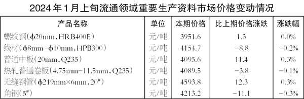 1月上旬,φ20毫米HRB400E螺紋鋼價格為3951.6元/噸,環比上漲1.3%;φ8毫米—φ10毫米,HPB300線材本期價格為4154.7元/噸,環比下降8.8%,降幅達0.2%;20毫米Q235普通中板價格為4095.6元/噸,環比上漲11.4%,漲幅達0.3%;4.75毫米—11.5毫米Q235熱軋普通卷板價格為4089.5元/噸,環比下降3.8%,降幅達0.1%;φ219毫米×6毫米20#無縫鋼管價格為4593.8元/噸,環比上漲12.3%,漲幅達0.3%;5#角鋼價格為4213.2元/噸,環比下降11.1%,降幅達0.3%。(郭同炬)