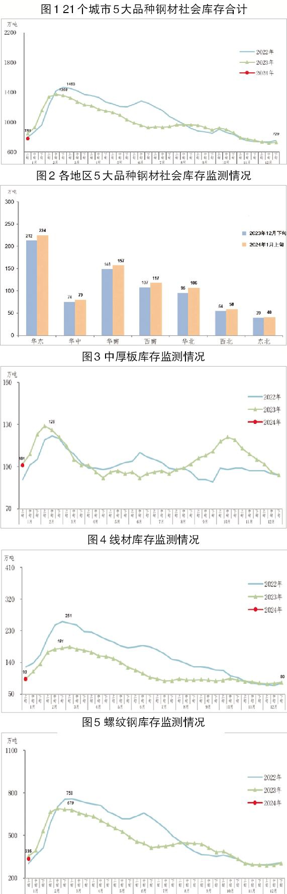 1月上旬,5大品種鋼材社會庫存環比均有所上升,其中螺紋鋼為增量最大品種,線材為升幅最大品種。熱軋卷板庫存為147萬噸,環比增加3萬噸,上升2.1%,庫存由降轉升;比2023年同期減少25萬噸,下降14.5%。冷軋卷板庫存為106萬噸,環比增加3萬噸,上升2.9%,庫存由降轉升;比2023年同期減少16萬噸,下降13.1%。中厚板庫存為101萬噸,環比增加7萬噸,上升7.4%,庫存由降轉升;比2023年同期減少1萬噸,下降1.0%。線材庫存為92萬噸,環比增加9萬噸,上升10.8%,庫存升幅擴大;比2023年同期減少1萬噸,下降1.1%。螺紋鋼庫存為335萬噸,環比增加30萬噸,上升9.8%,庫存升幅擴大;比2023年同期減少22萬噸,下降6.2%。