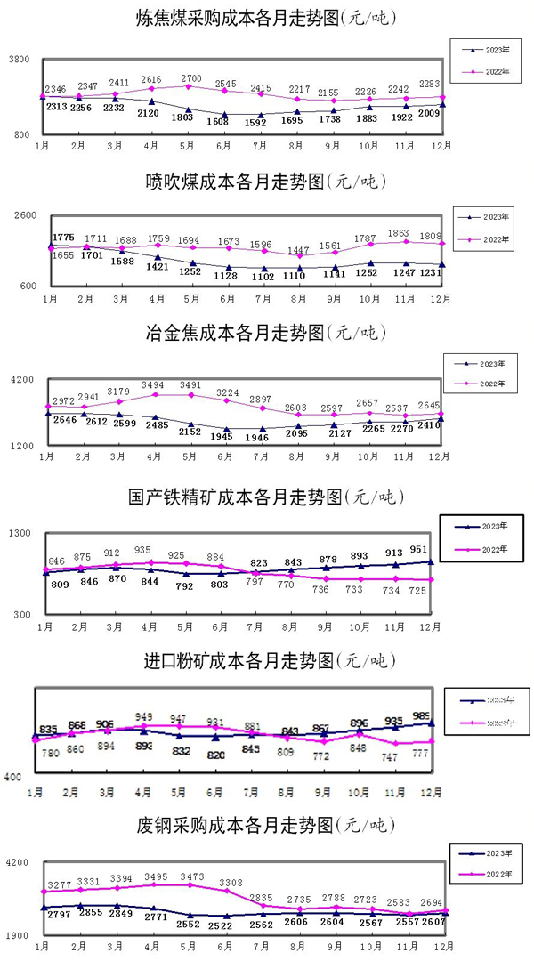 2023年1月—12月份,煉焦煤采購成本同比下降18.75%;冶金焦同比下降21.57%;國產鐵精礦同比上升4.37%,進口粉礦同比上升5.34%;廢鋼同比下降14.11%。
