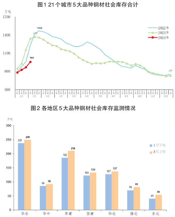2月上旬,21個城市5大品種鋼材社會庫存為956萬噸,環比增加90萬噸,上升10.4%,庫存連續5旬上升;比今年初增加227萬噸,上升31.1%;比去年同期減少385萬噸,下降28.7%。