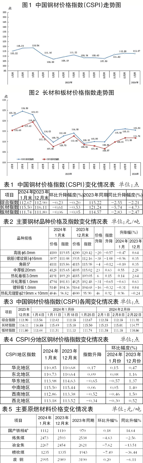 據中國鋼鐵工業協會監測,1月末,中國鋼材價格指數(CSPI)為112.67點,環比下降0.23點,降幅為0.20%;同比下降2.55點,降幅為2.21%。