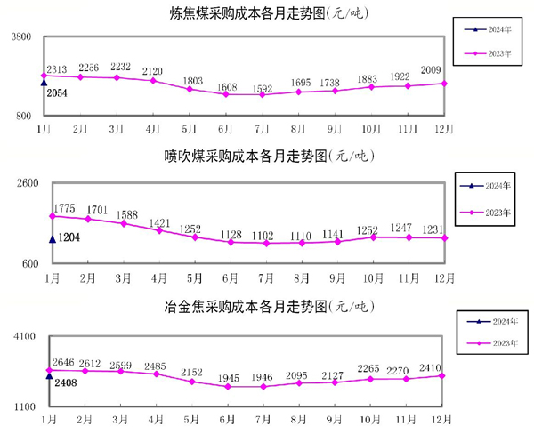 1月份,噴吹煤加權平均折算成幹基的采購成本為1204.40元/噸,環比下降26.22元/噸,降幅為2.13%;同比下降570.94元/噸,降幅為32.16%。