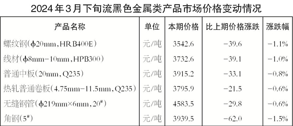 3月下旬6種黑色金屬產品價格環比均下降