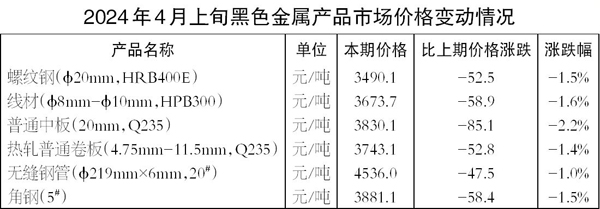 本報訊 據國家統計局對全國流通領域9大類50種重要生產資料市場價格的監測顯示,4月上旬與3月下旬相比,20種產品價格上漲,26種下降,4種持平。其中,6種黑色金屬產品價格環比均下降。