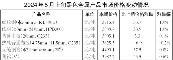 5月上旬,Φ20毫米HRB400E螺紋鋼價格為3715.4元/噸,環比上升35.7元/噸,升幅為1.0%;Φ8毫米~Φ10毫米HPB300線材價格為3889.7元/噸,環比上升38.9元/噸,升幅為1.0%;20毫米Q235普通中板價格為3905.1元/噸,環比上升3.3元/噸,升幅為0.1%;4.75毫米~11.5毫米Q235熱軋普通卷板價格為3825.5元/噸,環比下降6.9元/噸,降幅為0.2%;Φ219毫米×6毫米20#無縫鋼管價格為4493.1元/噸,環比下降37.5元/噸,降幅為0.8%;5#角鋼價格為3982.7元/噸,環比上升23.5元/噸,升幅為0.6%。 (郭同炬)