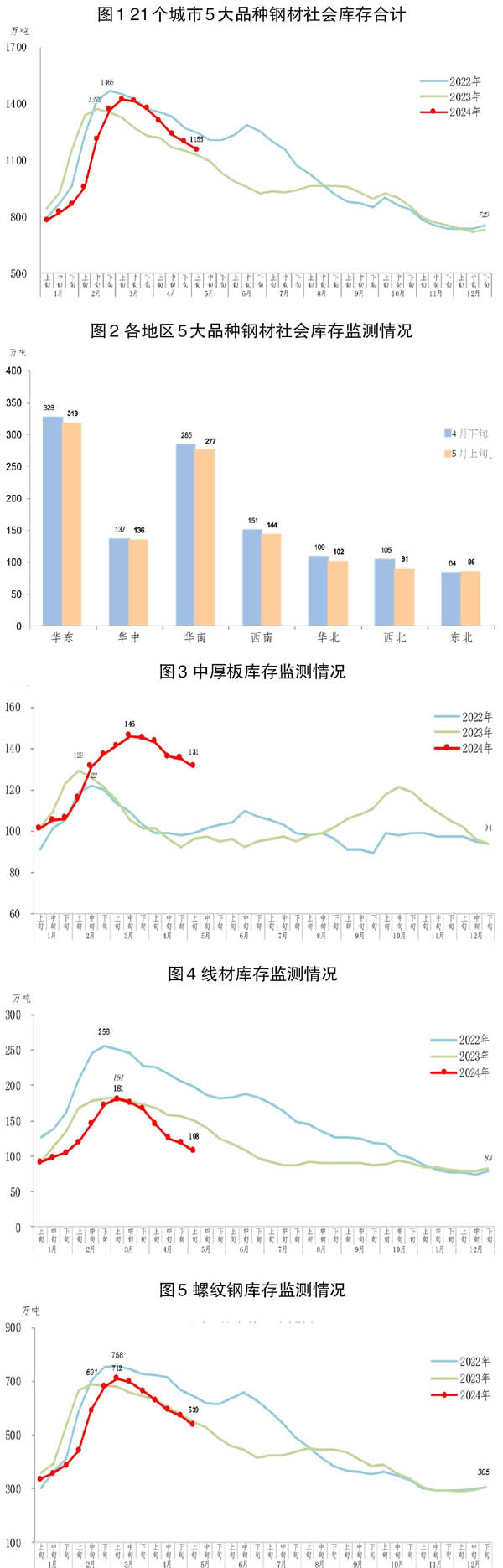 5月上旬,5大品種鋼材社會庫存除熱軋卷板環比上升外,其他品種全部下降,其中螺紋鋼為減量最大品種,線材為降幅最大品種。熱軋卷板庫存為242萬噸,環比增加6萬噸,上升2.5%,庫存由降轉升;比今年初增加98萬噸,上升68.1%;比上年同期增加33萬噸,上升15.8%。冷軋卷板庫存為135萬噸,環比減少2萬噸,下降1.5%,庫存連續小幅下降;比今年初增加32萬噸,上升31.1%;比上年同期增加11萬噸,上升8.9%。中厚板庫存為131萬噸,環比減少4萬噸,下降3.0%;比今年初增加37萬噸,上升39.4%;比上年同期增加35萬噸,上升36.5%。線材庫存為108萬噸,環比減少11萬噸,下降9.2%,庫存降幅擴大;比今年初增加25萬噸,上升30.1%;比上年同期減少43萬噸,下降28.5%。螺紋鋼庫存為539萬噸,環比減少33萬噸,下降5.8%,庫存持續下降;比今年初增加234萬噸,上升76.7%;比上年同期減少11萬噸,下降2.0%。