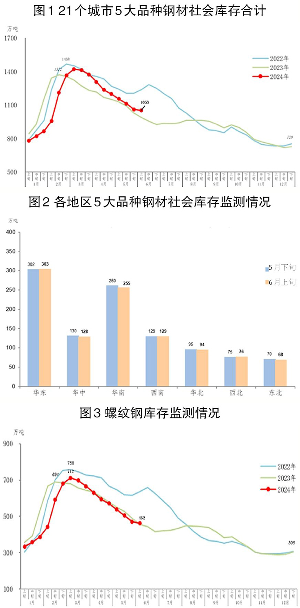 6月上旬,5大(da)品(pin)種(zhong)鋼(gang)材(cai)社(she)會(hui)庫(ku)存(cun)環(huan)比(bi)各(ge)有(you)升(sheng)降(jiang)。其(qi)中(zhong),螺(luo)紋(wen)鋼(gang)為(wei)減(jian)量(liang)最(zui)大(da)的(de)品(pin)種(zhong),線(xian)材(cai)為(wei)降(jiang)幅(fu)最(zui)大(da)的(de)品(pin)種(zhong),中(zhong)厚(hou)板(ban)為(wei)增(zeng)量(liang)和(he)增(zeng)幅(fu)最(zui)大(da)的(de)品(pin)種(zhong)。熱(re)軋(zha)卷(juan)板(ban)庫(ku)存(cun)為(wei)240萬噸,環比減少1萬噸,下降0.4%,庫存高位波動;比今年初增加96萬噸,上升66.7%;比上年同期增加40萬噸,上升20.0%。冷軋卷板庫存為135萬噸,環比增加1萬噸,上升0.7%,庫存由降轉升;比今年初增加32萬噸,上升31.1%;比上年同期增加17萬噸,上升14.4%。中厚板庫存為121萬噸,環比增加3萬噸,上升2.5%,庫存由降轉升;比今年初增加27萬噸,上升28.7%;比上年同期增加25萬噸,上升26.0%。線材庫存為95萬噸,環比減少2萬噸,下降2.1%,庫存繼續下降;比今年初增加12萬噸,上升14.5%;比上年同期減少23萬噸,下降19.5%。螺紋鋼庫存為462萬噸,環比減少9萬噸,下降1.9%,庫存降幅收窄;比今年初增加157萬噸,上升51.5%;比上年同期增加5萬噸,上升1.1%。
