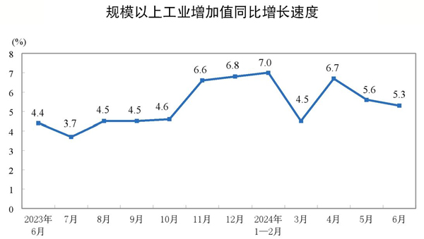 本報訊 6月份,規模以上工業增加值同比實際增長5.3%(增加值增速均為扣除價格因素的實際增長率),環比增長0.42%,其中黑色金屬冶煉和壓延加工業增加值同比增長3.3%;鋼產量為9161萬噸,同比增長0.2%。