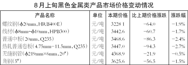 8月上旬6種黑色金屬類產品價格環比均下降