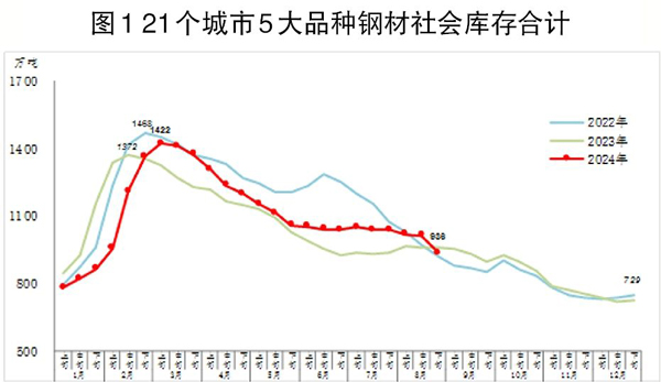 8月下旬,21個城市5大品種鋼材社會庫存為936萬噸,環比減少79萬噸,下降7.8%,庫存降幅擴大;比7月下旬減少104萬噸,下降10.0%;比今年初增加207萬噸,上升28.4%;比上年同期減少26萬噸,下降2.7%。