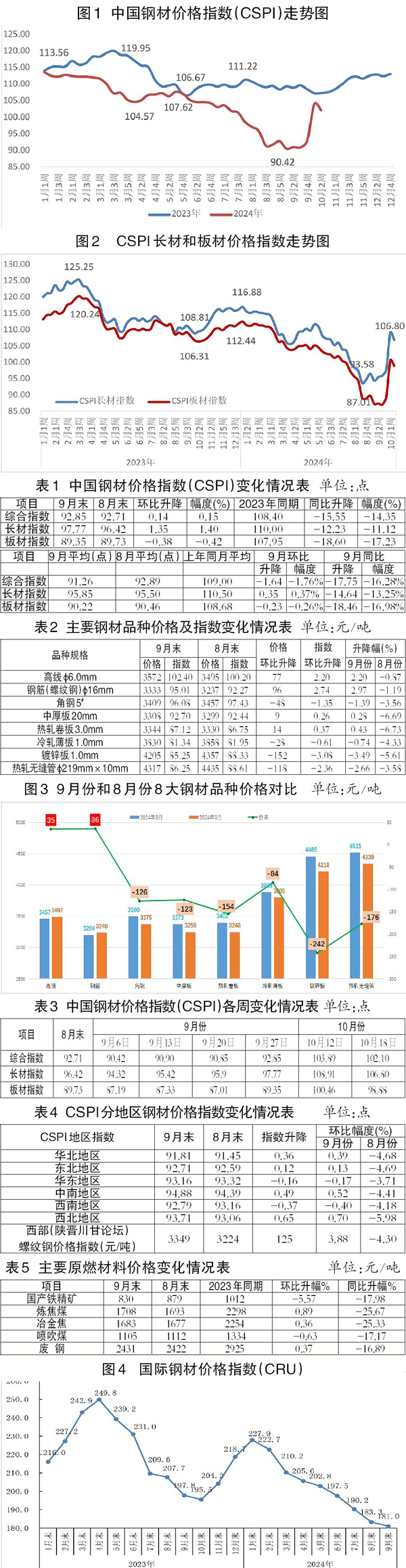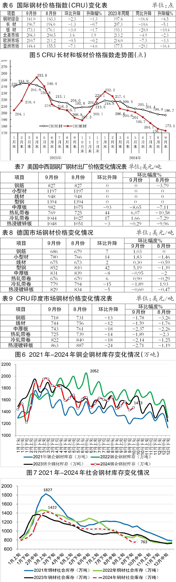 9月份,CRU長材指數為196.7點,環比下降1.3點,降幅為0.7%;CRU板材指數為173.1點,環比下降3.0點,降幅為1.7%。與去年同期相比,CRU長材指數下降10.6點,降幅為5.1%;CRU板材指數下降20.0點,降幅為10.4%。