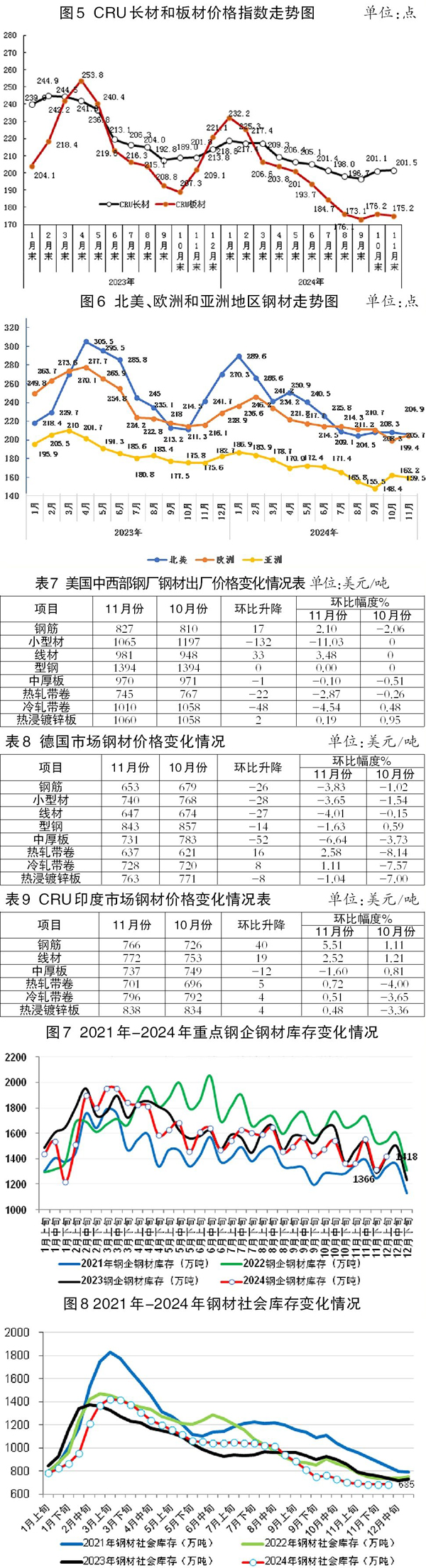 11月份,CRU北美鋼材價格指數為205.7點,環比下降2.6點,降幅為1.2%。美國製造業PMI為48.4%,環比上升1.9個百分點,但仍處於萎縮區間。11月份,美國中西部鋼廠鋼材價格以下降為主,小型材明顯下降,熱軋帶卷、冷軋帶卷小幅下降,中厚板穩中有降,線材、鋼筋小幅上升,熱浸鍍鋅板穩中有升,型鋼保持平穩。