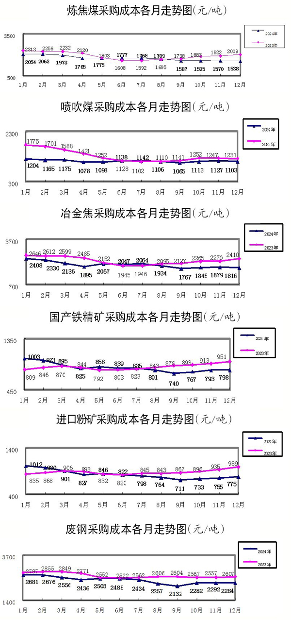 2024年,煉焦煤采購成本同比下降8.72%;冶金焦同比下降12.41%;國產鐵精礦同比下降1.68%,進口粉礦同比下降6.23%;廢鋼同比下降8.75%。