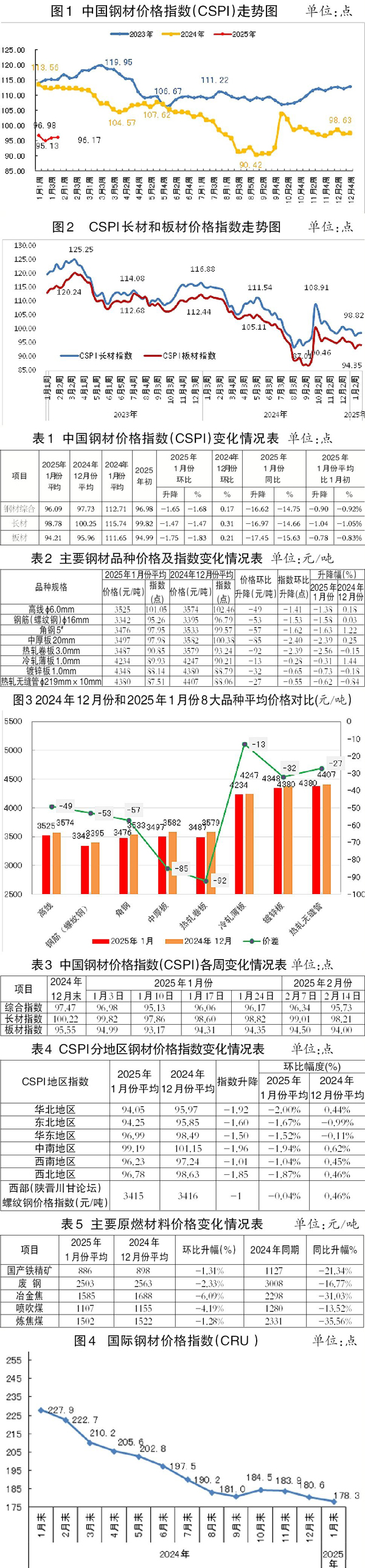 1月份,CRU國際鋼材價格指數為178.3點,環比下降2.3點,降幅為1.3%;同比下降49.6點,降幅為21.8%。