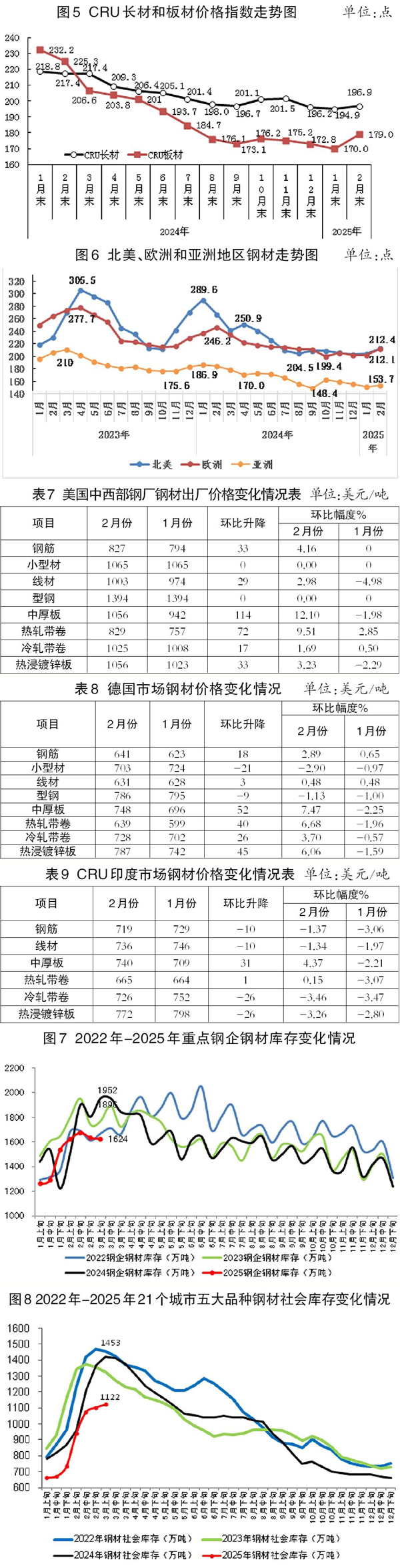 2月份,CRU長材指數為196.9點,環比上升2.0點、升幅為1.0%;CRU板材指數為179.0點,環比上升9.0點、升幅為5.3%。與去年同期相比,2月份CRU長材指數下降20.5點、降幅為9.4%;CRU板材指數下降46.3點、降幅為20.6%。