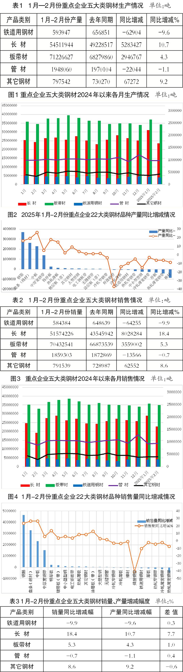 1月—2月份,重點企業生產的22大類品種鋼材,鋼筋、盤條(線材)、中板、中厚寬鋼帶、特厚板、熱軋薄板、鍍層板(帶)、其它鋼材、大型型鋼、電工鋼板帶、無縫鋼管、塗層板(帶)等12個品種產量同比增加,棒材、熱軋薄寬鋼帶、厚板、冷軋薄寬鋼帶、中小型型鋼、熱軋窄鋼帶、鐵道用鋼材、冷軋薄板、焊接鋼管、冷軋窄鋼帶等10個品種產量同比減少。
