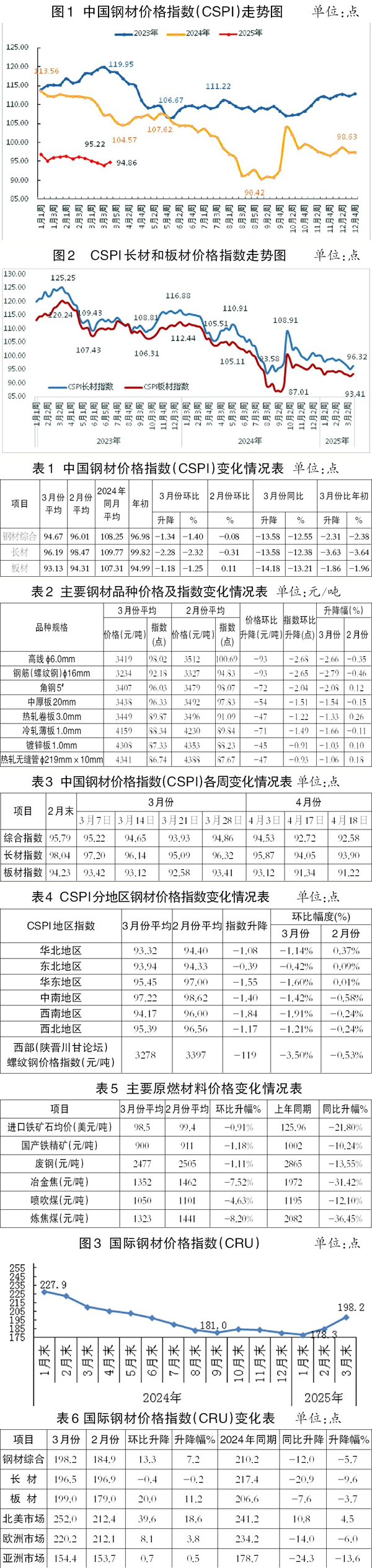 截至3月末,CSPI長材指數為96.32點,環比下降1.72點、降幅為1.75 %,CSPI板材指數為93.41點,環比下降0.82點、降幅為0.87%。截至3月末,CSPI長材、板材指數分別同比下降9.72點、11.10點,降幅分別為9.17%、10.62 %。