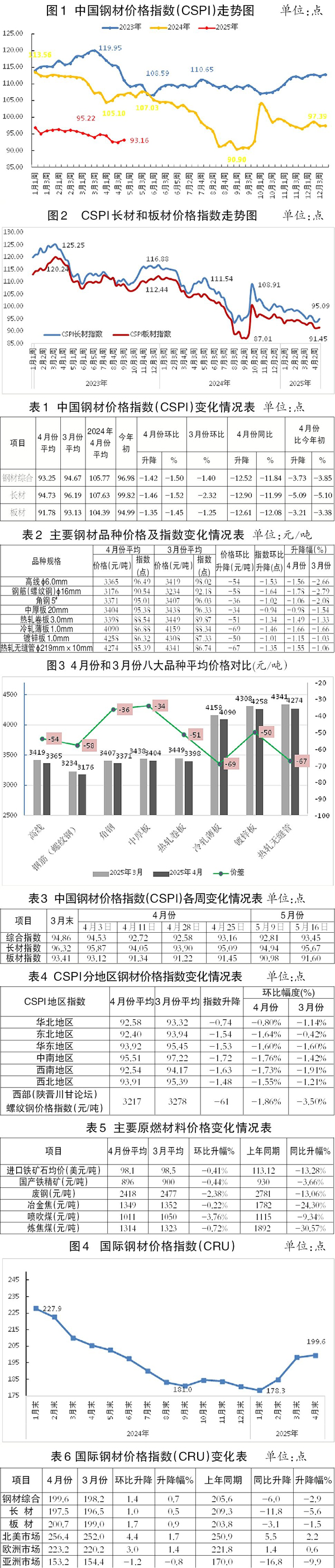 4月份,在美國關稅戰持續擾動、原燃料價格延續下行、需求回暖但仍不及預期的影響下,國內鋼材市場價格整體呈現震蕩下行運行態勢。進入5月份,鋼材需求由旺季向淡季轉換,鋼材價格呈窄幅震蕩運行態勢。