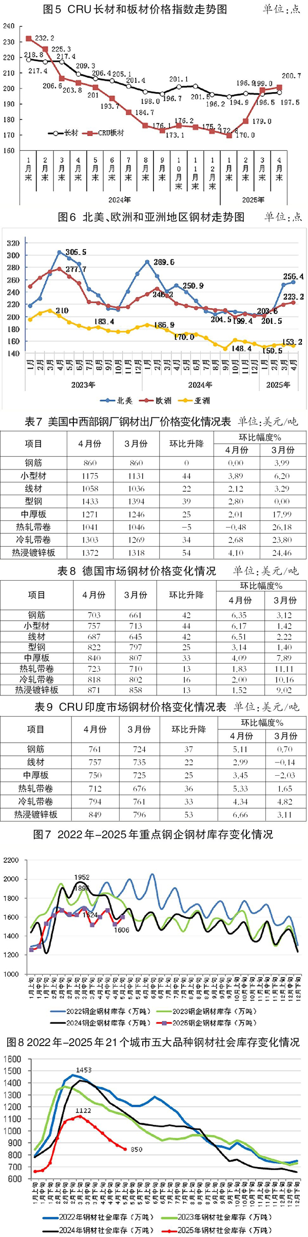 4月份,CRU國際鋼材價格指數為199.6點,環比上升1.4點、升幅為0.7%;同比下降6.0點、降幅為2.9%。