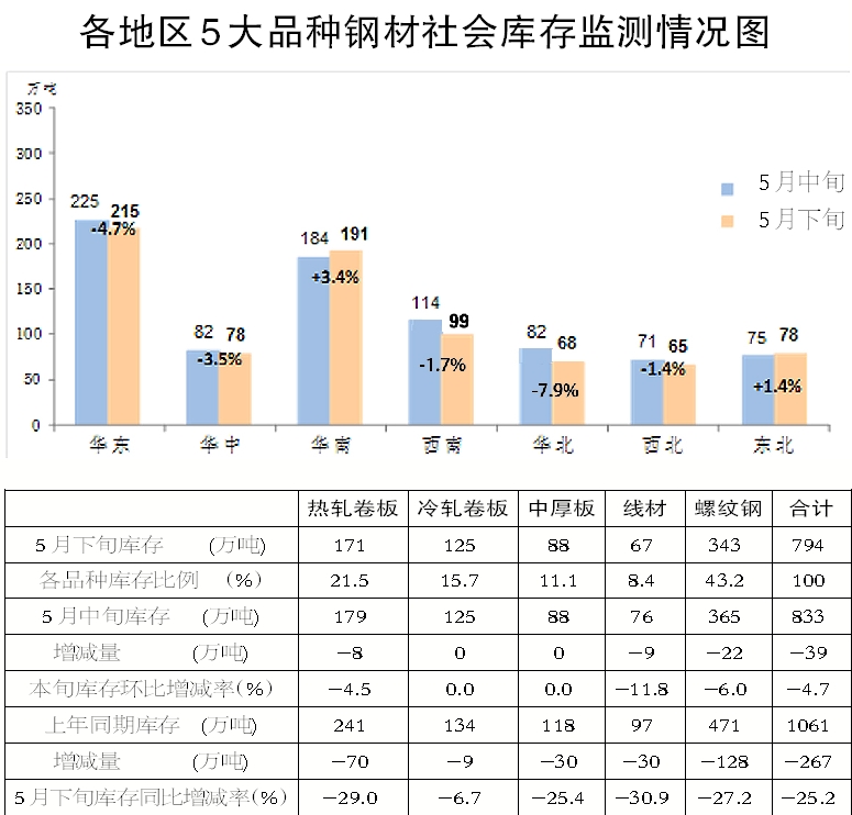 5月下旬,5大(da)品(pin)種(zhong)鋼(gang)材(cai)社(she)會(hui)庫(ku)存(cun)環(huan)比(bi)除(chu)冷(leng)軋(zha)卷(juan)板(ban)和(he)中(zhong)厚(hou)板(ban)持(chi)平(ping)外(wai),其(qi)他(ta)品(pin)種(zhong)均(jun)有(you)所(suo)下(xia)降(jiang)。其(qi)中(zhong),螺(luo)紋(wen)鋼(gang)為(wei)減(jian)量(liang)最(zui)大(da)品(pin)種(zhong),線(xian)材(cai)為(wei)降(jiang)幅(fu)最(zui)大(da)品(pin)種(zhong)。同(tong)比(bi)來(lai)看(kan),5月下旬,5大品種社會庫存均有不同程度下降,具體見下表。