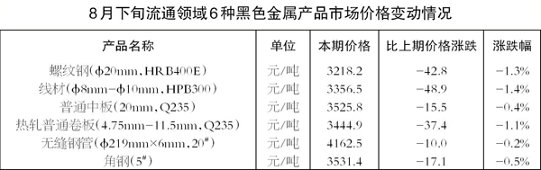 8月下旬6種黑色金屬類產品市場價格環比全部下降