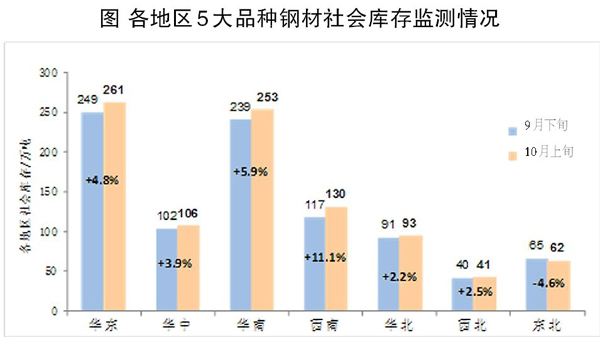 10月上旬,分地區來看,7大區域鋼材社會庫存除東北地區環比小幅下降外,其他區域均有所上升,其中西南地區上升幅度最大。