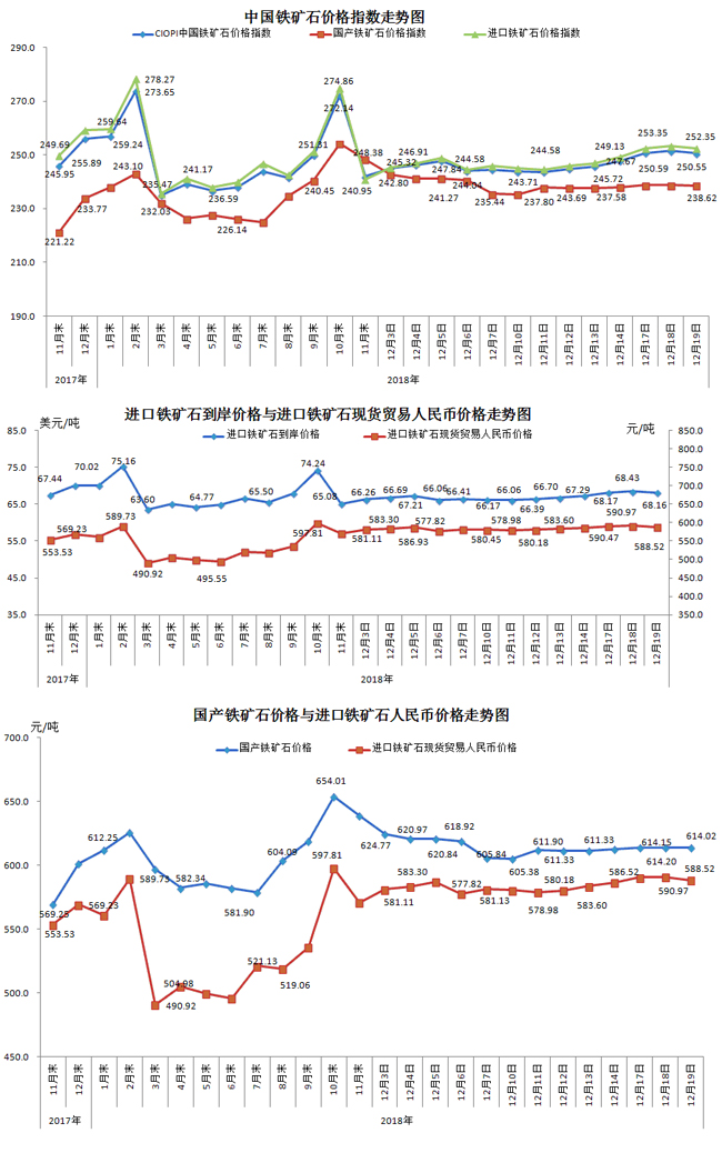 12月19日,中國鐵礦石價格指數(CIOPI)250.55點,環比下降0.88點,降幅為0.35%。其中:國產鐵礦石價格指數為238.62點,環比下降0.07點,降幅為0.03%;進口鐵礦石價格指數為252.35點,環比下降1.00點,降幅為0.39%。