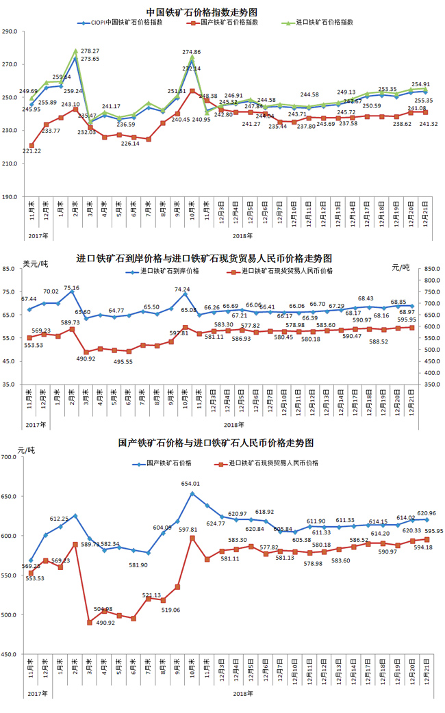 12月21日,中國鐵礦石價格指數(CIOPI)253.51點,環比上升0.42點,升幅為0.17%。其中:國產鐵礦石價格指數為241.32點,環比上升0.24點,升幅為0.10%;進口鐵礦石價格指數為255.35點,環比上升0.44點,升幅為0.17%。