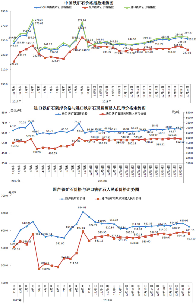 12月24日,中國鐵礦石價格指數(CIOPI)252.33點,環比下降1.18點,降幅為0.46%。其中:國產鐵礦石價格指數為237.51點,環比下降3.81點,降幅為1.58%;進口鐵礦石價格指數為254.57點,環比下降0.78點,降幅為0.30%。