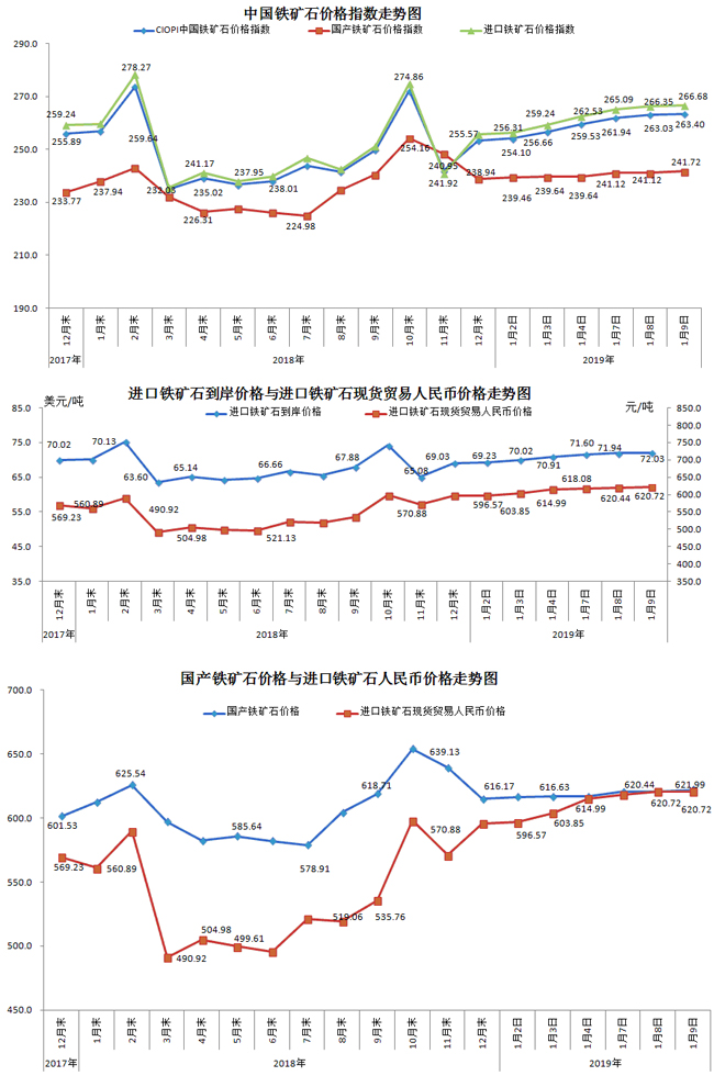 1月9日,中國鐵礦石價格指數(CIOPI)263.40點,環比上升0.37點,升幅為0.14%。其中:國產鐵礦石價格指數為241.72點,環比上升0.60點,升幅為0.25%;進口鐵礦石價格指數為266.68點,環比上升0.33點,升幅為0.13%。