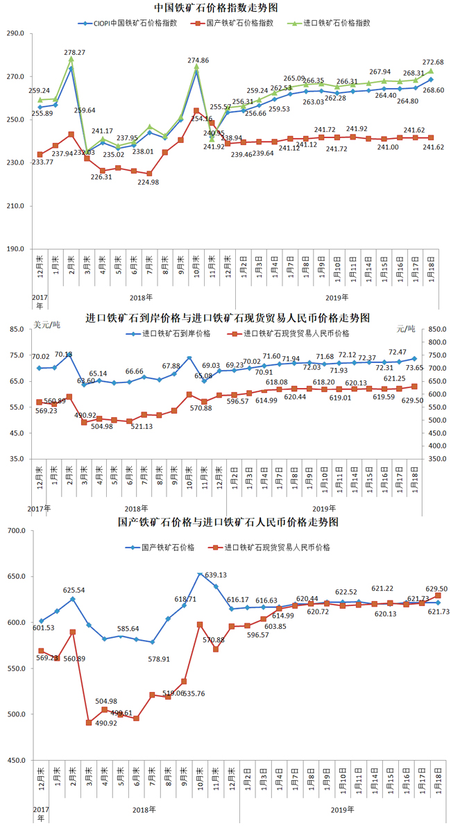 1月18日,中國鐵礦石價格指數(CIOPI)268.60點,環比上升3.80點,升幅為1.43%。其中:國產鐵礦石價格指數為241.62點,環比持平;進口鐵礦石價格指數為272.68點,環比上升4.37點,升幅為1.63%。