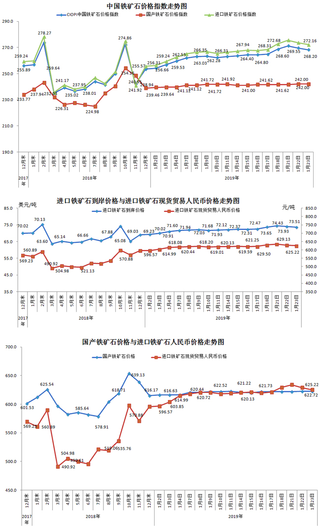 1月23日,中國鐵礦石價格指數(CIOPI)268.20點,環比下降1.35點,降幅為0.50%。其中:國產鐵礦石價格指數為242.00點,環比持平;進口鐵礦石價格指數為272.16點,環比下降1.55點,降幅為0.57%。