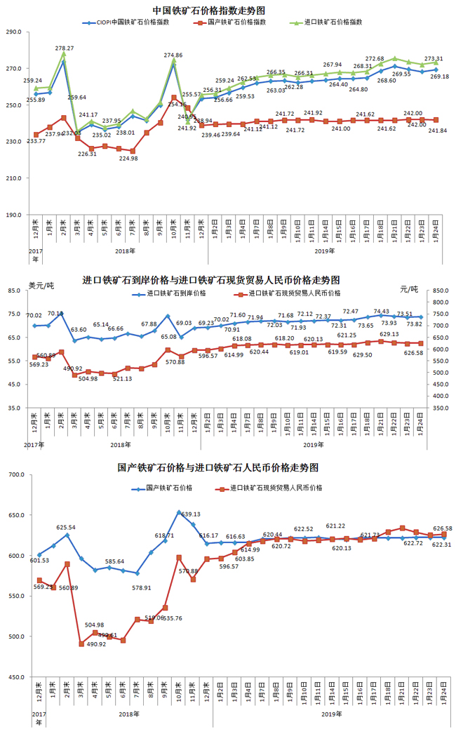 1月24日,中國鐵礦石價格指數(CIOPI)269.18點,環比上升0.98點,升幅為0.36%。其中:國產鐵礦石價格指數為241.84點,環比下降0.16點,降幅為0.06%;進口鐵礦石價格指數為273.31點,環比上升1.15點,升幅為0.42%。