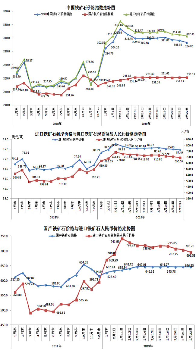 2月22日,中國鐵礦石價格指數(CIOPI)303.01點,環比下降3.35點,降幅為1.09%。其中:國產鐵礦石價格指數為251.17點,環比持平;進口鐵礦石價格指數為312.81點,環比下降1.89點,降幅為0.60%。