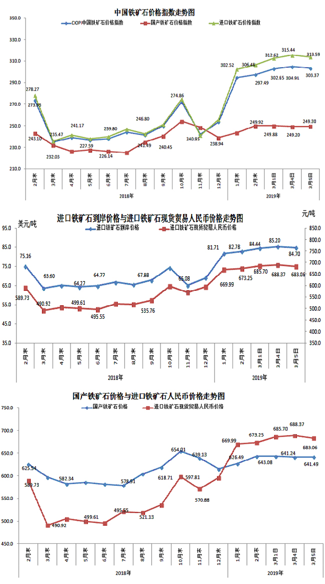 3月5日,中國鐵礦石價格指數(CIOPI)303.37點,環比下降1.54點,降幅為0.51%。其中:國產鐵礦石價格指數為249.30點,環比上升0.09點,升幅為0.04%;進口鐵礦石價格指數為313.59點,環比下降1.85點,降幅為0.59%。