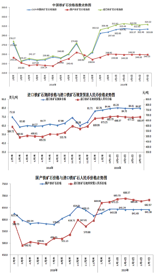 3月7日,中國鐵礦石價格指數(CIOPI)303.89點,環比上升1.43點,升幅為0.47%。其中:國產鐵礦石價格指數為249.25點,環比下降0.04點,降幅為0.02%;進口鐵礦石價格指數為314.22點,環比上升1.70點,升幅為0.54%。