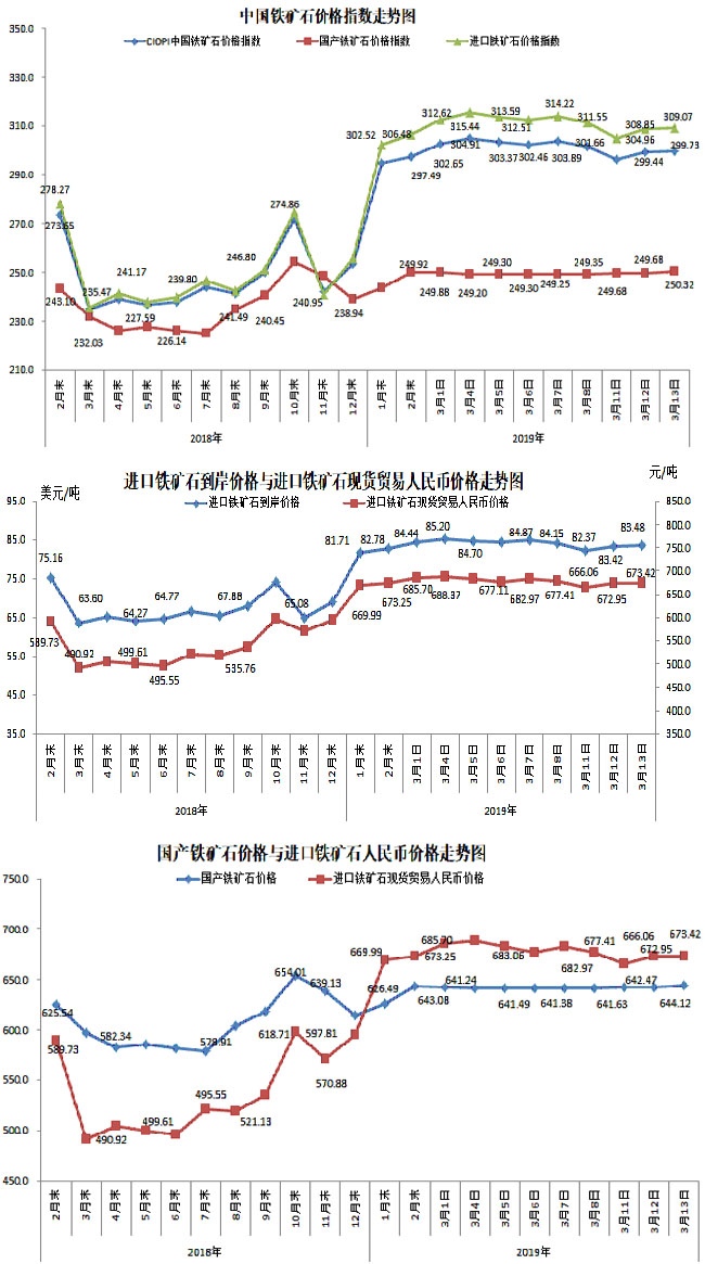 3月13日,中國鐵礦石價格指數(CIOPI)299.73點,環比上升0.29點,升幅為0.10%。其中:國產鐵礦石價格指數為250.32點,環比上升0.64點,升幅為0.26%;進口鐵礦石價格指數為309.07點,環比上升0.22點,升幅為0.07%。