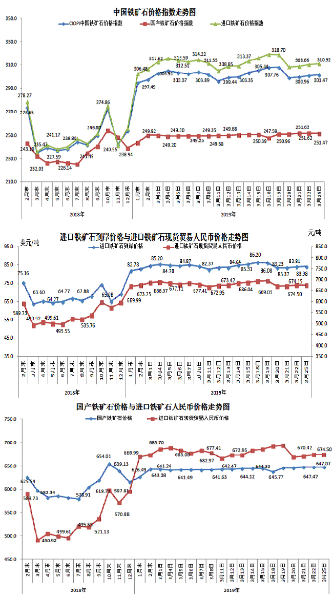 3月25日,中國鐵礦石價格指數(CIOPI)301.47點,環比上升0.50點,升幅為0.17%。其中:國產鐵礦石價格指數為251.47點,環比下降0.15點,降幅為0.06%;進口鐵礦石價格指數為310.92點,環比上升0.63點,升幅為0.20%。
