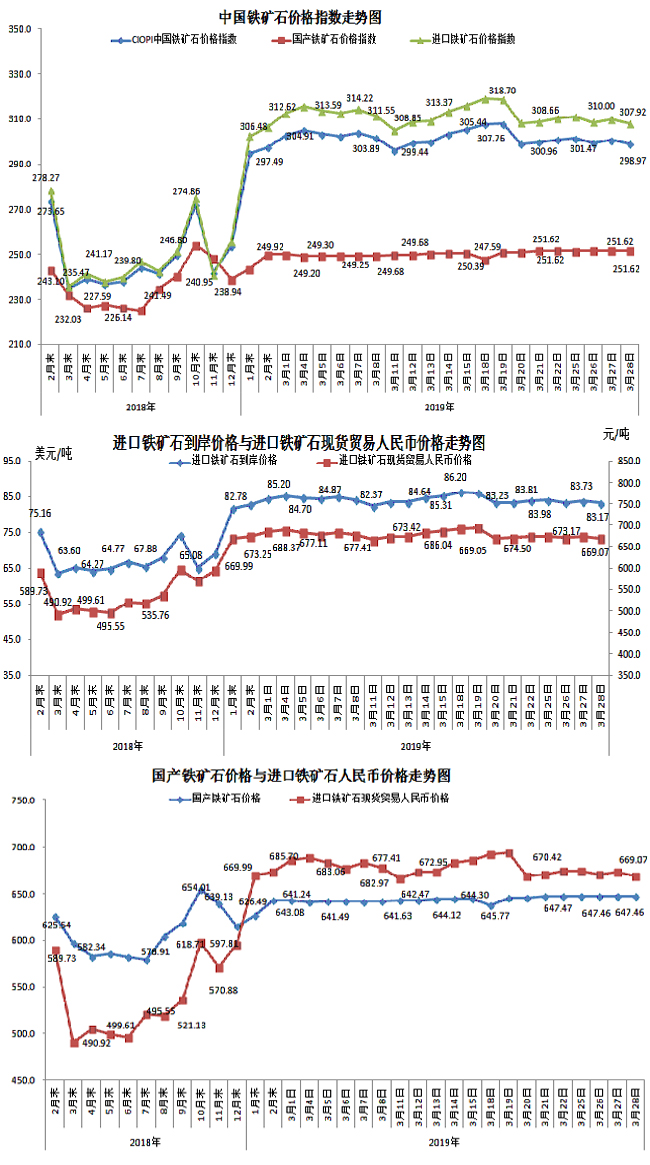 3月28日,中國鐵礦石價格指數(CIOPI)298.97點,環比下降1.74點,降幅為0.58%。其中:國產鐵礦石價格指數為251.62點,環比持平;進口鐵礦石價格指數為307.92點,環比下降2.07點,降幅為0.67%。