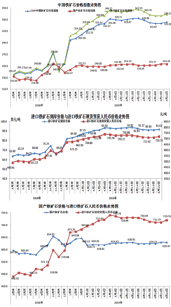 4月22日,中國鐵礦石價格指數(CIOPI)325.58點,環比上升2.42點,升幅為0.75%。其中:國產鐵礦石價格指數為253.29點,環比下降0.04點,降幅為0.02%;進口鐵礦石價格指數為339.24點,環比上升2.89點,升幅為0.86%。