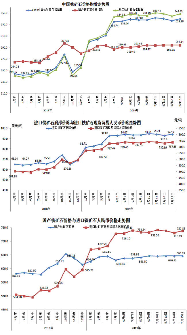 5月15日,中國鐵礦石價格指數(CIOPI)339.98點,環比上升3.30點,升幅為0.98%。其中:國產鐵礦石價格指數為294.14點,環比上升0.21點,升幅為0.07%;進口鐵礦石價格指數為348.65點,環比上升3.89點,升幅為1.13%。