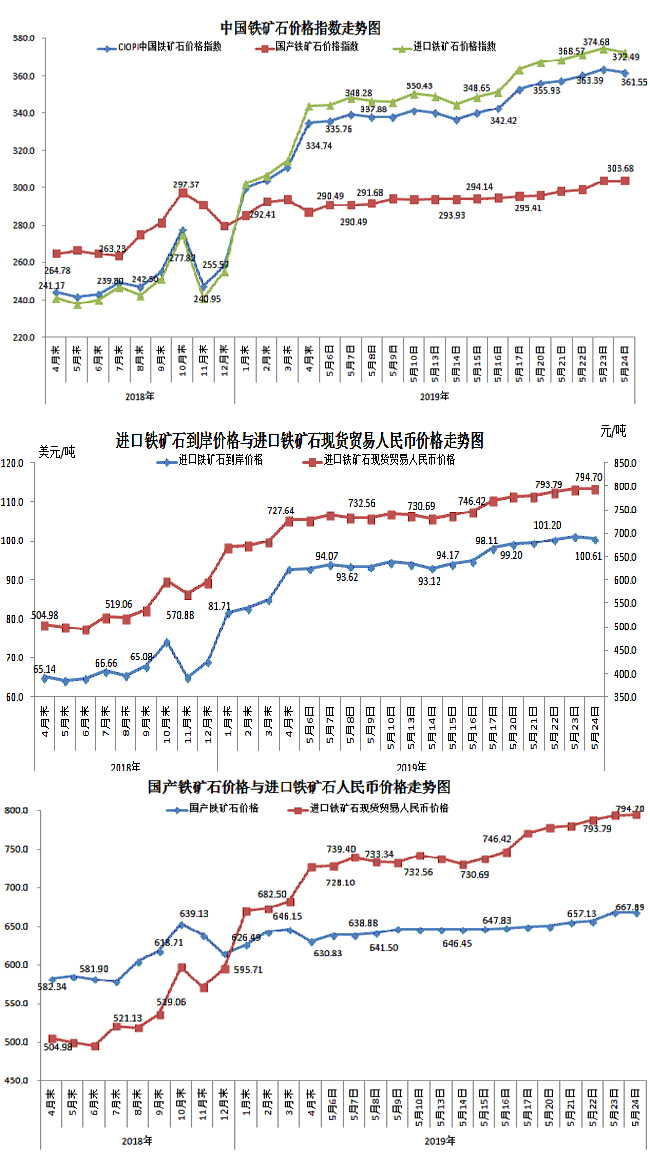 5月24日,中國鐵礦石價格指數(CIOPI)361.55點,環比下降1.84點,降幅為0.51%。其中:國產鐵礦石價格指數為303.68點,環比持平;進口鐵礦石價格指數為372.49點,環比下降2.18點,降幅為0.58%。