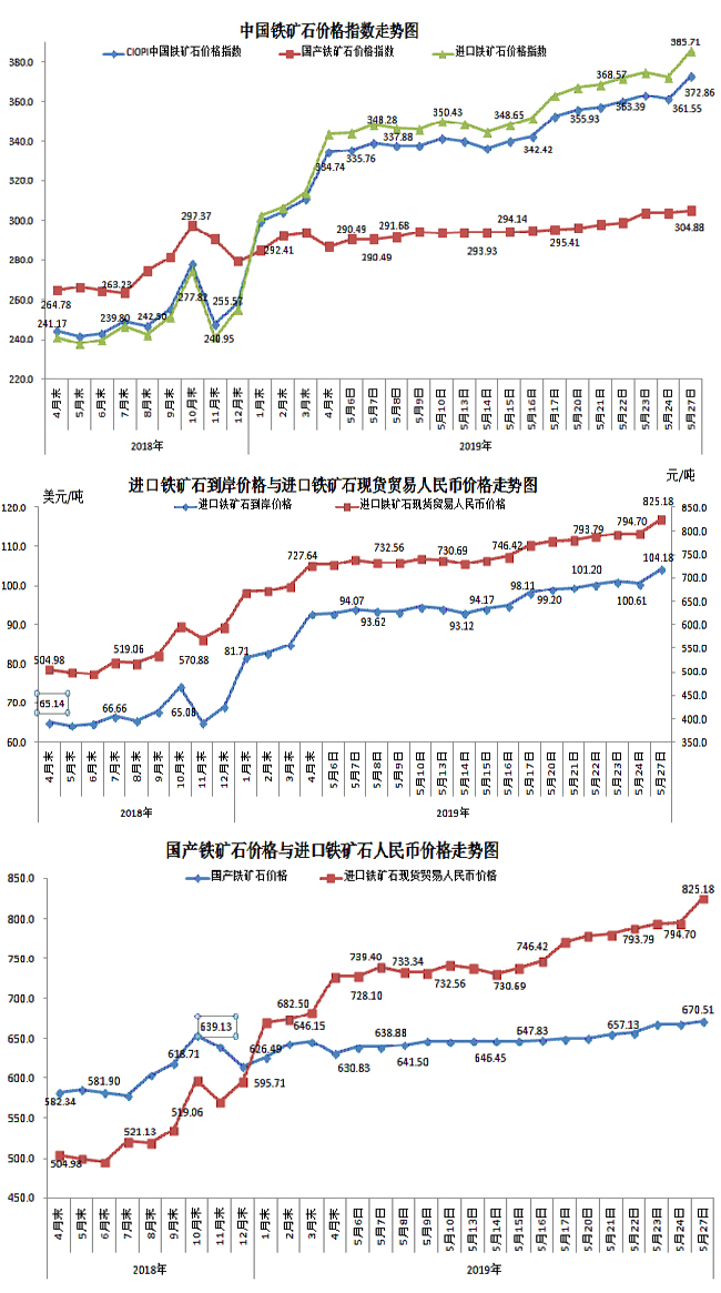 5月27日,中國鐵礦石價格指數(CIOPI)372.86點,環比上升11.31點,升幅為3.13%。其中:國產鐵礦石價格指數為304.88點,環比上升1.19點,升幅為0.39%;進口鐵礦石價格指數為385.71點,環比上升13.22點,升幅為3.55%。