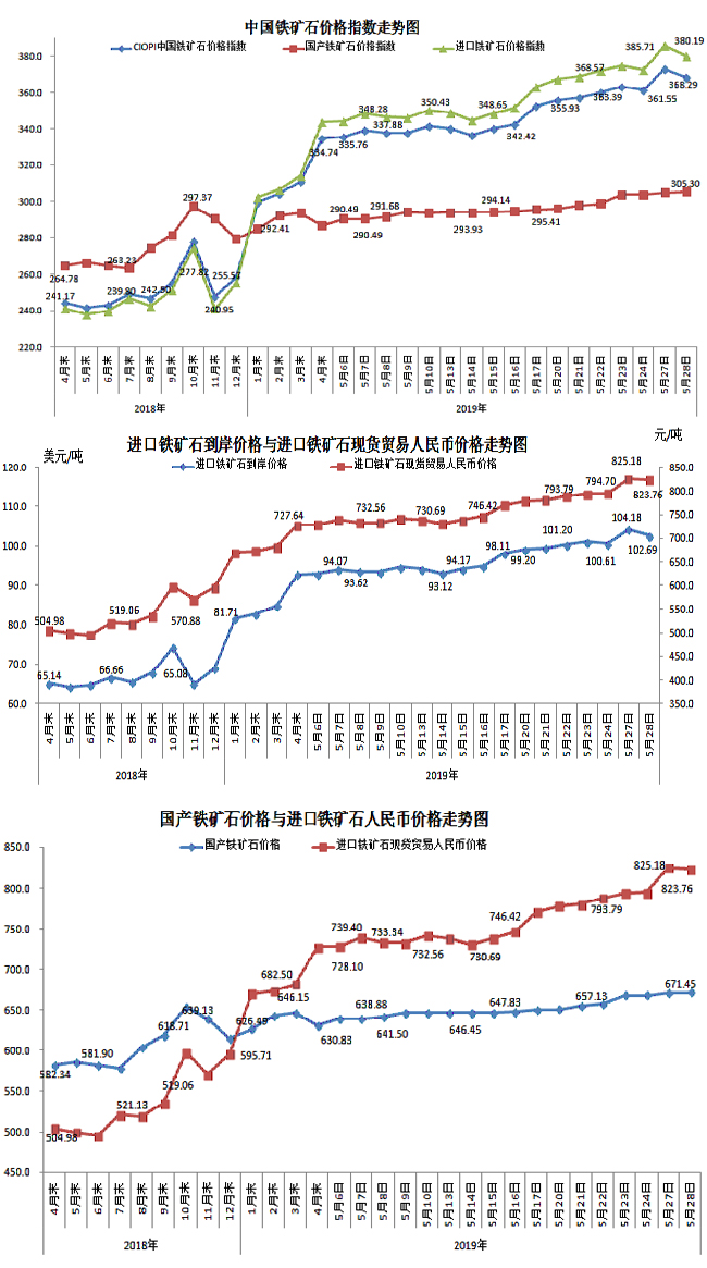 5月28日,中國鐵礦石價格指數(CIOPI)368.29點,環比下降4.57點,降幅為1.23%。其中:國產鐵礦石價格指數為305.30點,環比上升0.43點,升幅為0.14%;進口鐵礦石價格指數為380.19點,環比下降5.52點,降幅為1.43%。