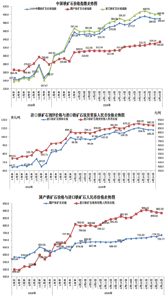 6月26日,中國鐵礦石價格指數(CIOPI)390.02點,環比上升0.12點,升幅為0.03%。其中:國產鐵礦石價格指數為334.09點,環比上升4.85點,升幅為1.47%;進口鐵礦石價格指數為400.59點,環比下降0.78點,降幅為0.19%。