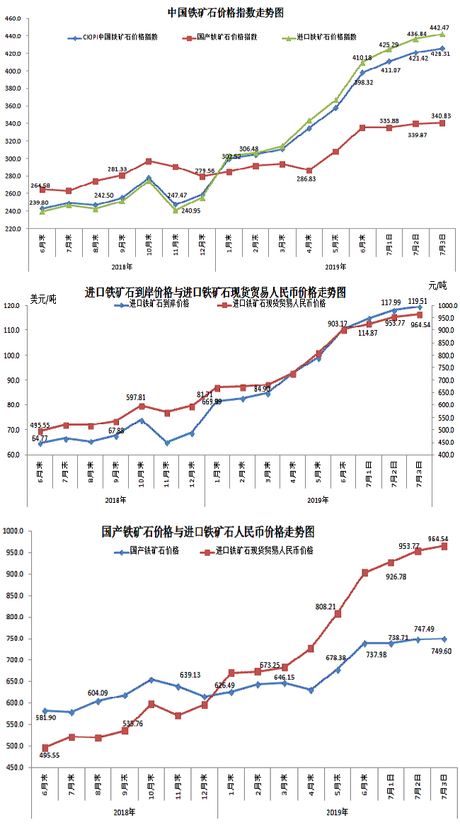 7月3日,中國鐵礦石價格指數(CIOPI)426.31點,環比上升4.89點,升幅為1.16%。其中:國產鐵礦石價格指數為340.83點,環比上升0.96點,升幅為0.28%;進口鐵礦石價格指數為442.47點,環比上升5.63點,升幅為1.29%。