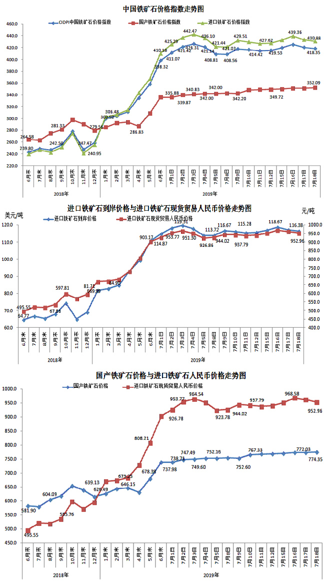 7月18日,國產鐵礦石62%品位幹基鐵精礦含稅價格為774.35元/噸,環比每噸上升2.32元,升幅為0.30%;比進口鐵礦石低178.61元/噸,降幅為18.74%;當月平均價格為759.59元/噸,比進口鐵礦石低186.56元/噸,降幅為19.72%。