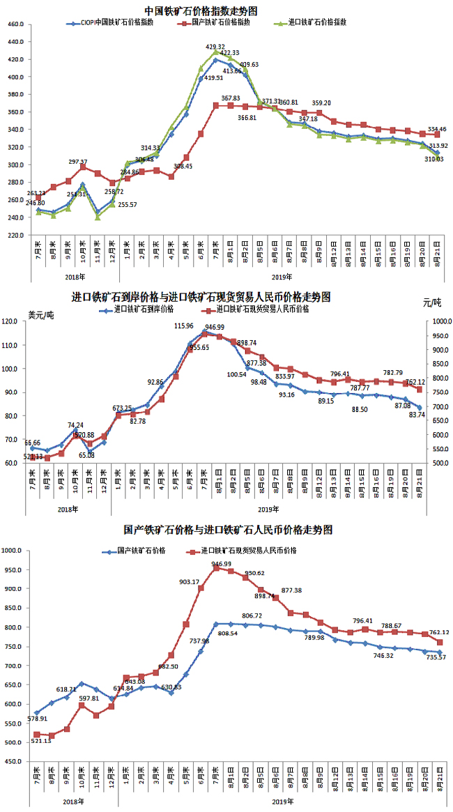 8月21日,中國鐵礦石價格指數(CIOPI)313.92點,環比下降10.54點,降幅為3.25%。其中:國產鐵礦石價格指數為334.46點,環比下降0.89點,降幅為0.27%;進口鐵礦石價格指數為310.03點,環比下降12.37點,降幅為3.84%。