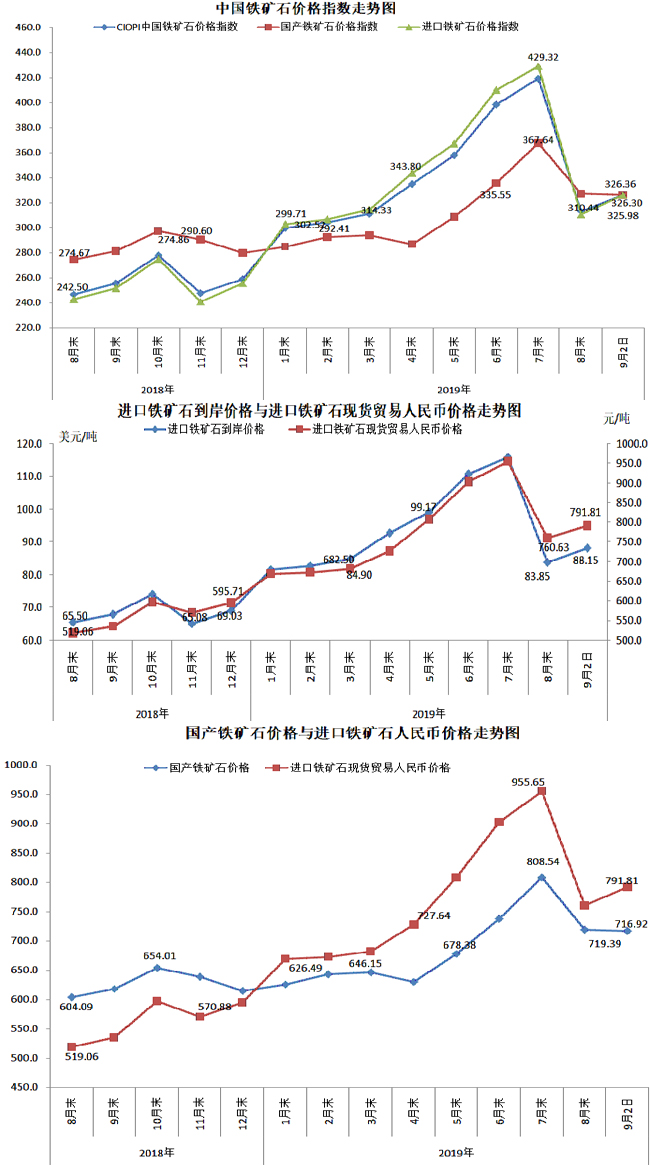 9月2日,現貨貿易進口鐵礦石62%品位幹基粉礦人民幣含稅價格為791.81元/噸,環比每噸上升31.18元,升幅為4.10%,當月平均價格為791.81元/噸。