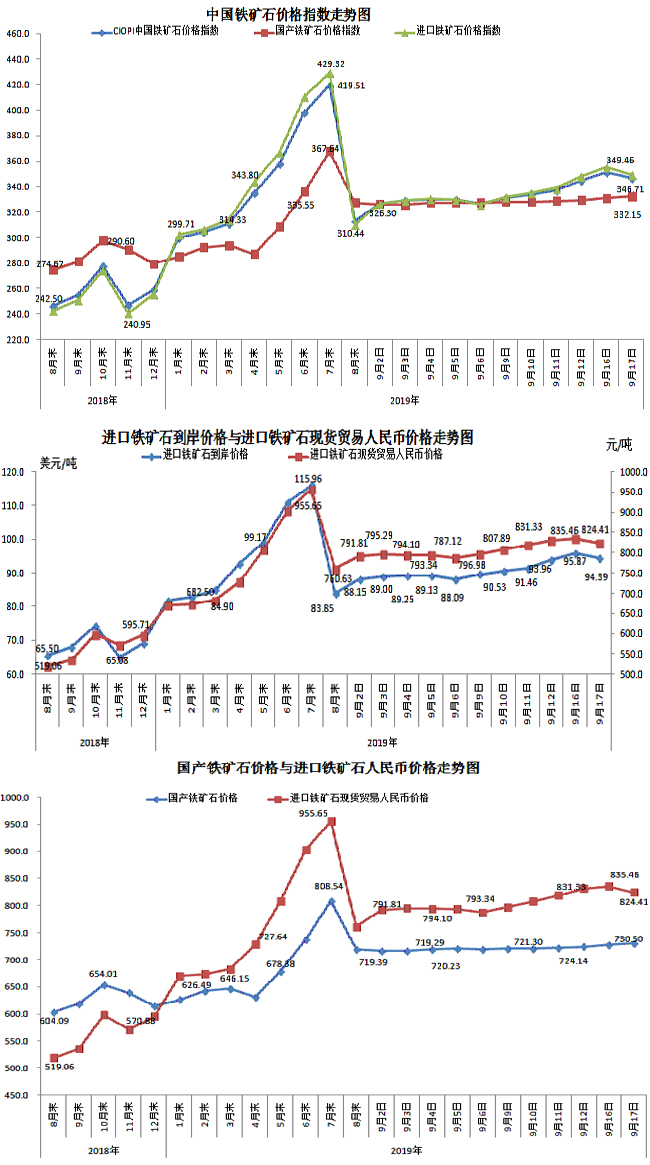 9月17日,中國鐵礦石價格指數(CIOPI)346.71點,環比下降4.40點,降幅為1.25%。其中:國產鐵礦石價格指數為332.15點,環比上升1.33點,升幅為0.40%;進口鐵礦石價格指數為349.46點,環比下降5.48點,降幅為1.54%。